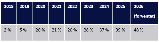 Andelen af nye flytyper der opererer til og fra Københavns Lufthavn er steget markant de seneste år. Fra beskedne 2 % i 2018 til 48 %, som er den nyeste prognose for 2026:
